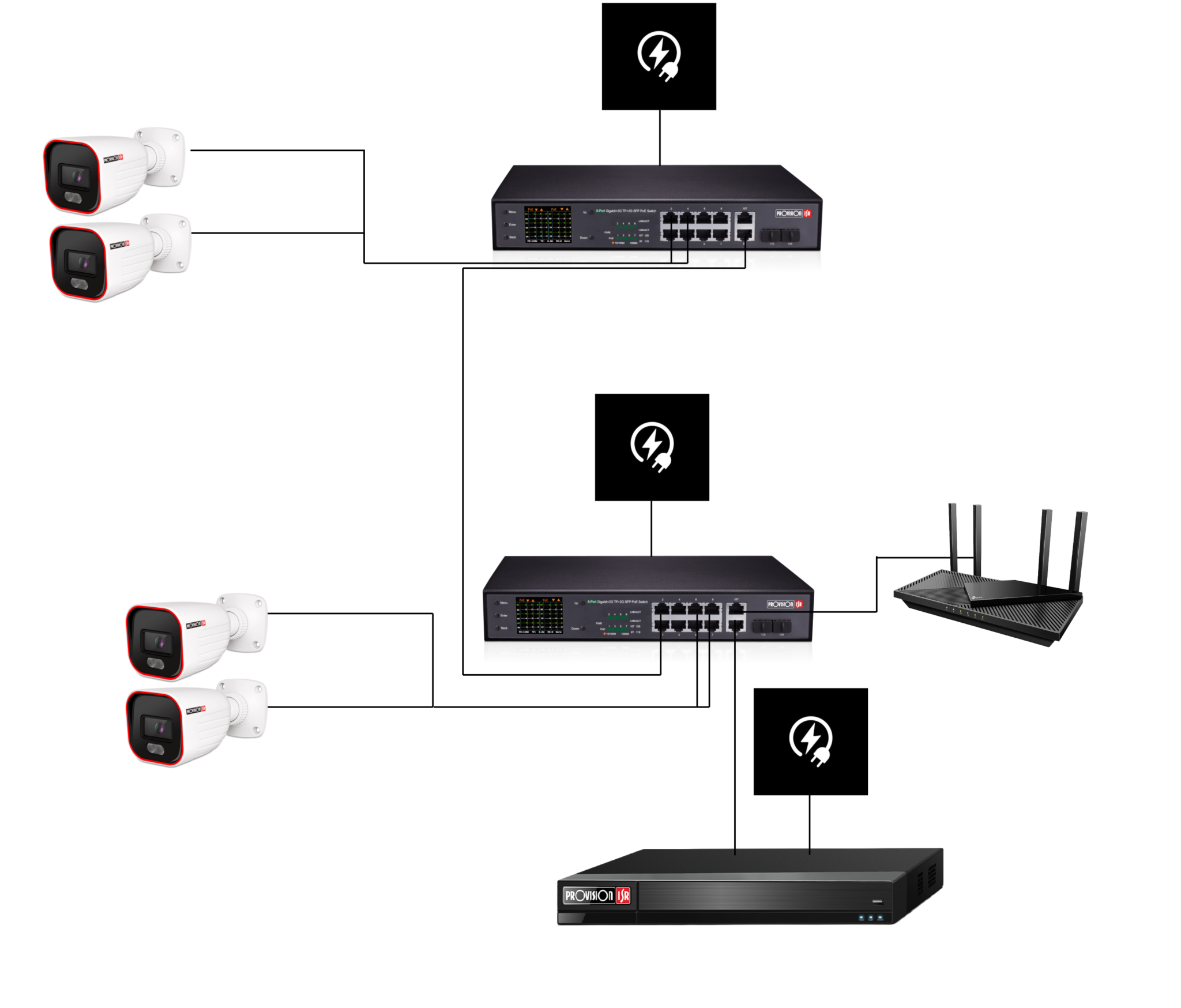 Centraliserat strömsystem: Dessutom, som nämnts tidigare, kan ström överföras från huvudnätverksenheten via Ethernet-kabel. Det går att skapa ett centraliserat strömsystem med enklare hantering och bättre skydd för strömkällan, vilket möjliggör en säkrare videoövervakning.
